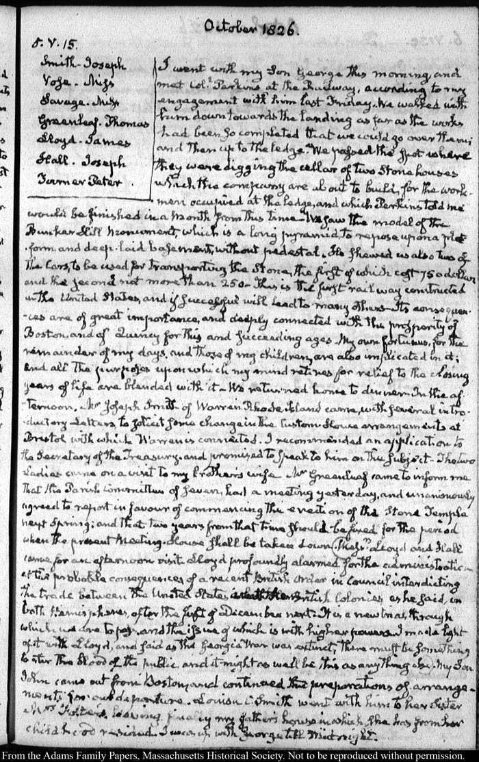 View full, authoritative transcriptions with page images of the diaries at John Quincy Adams Digital Diary part of the Primary Source Cooperative at the MHS.