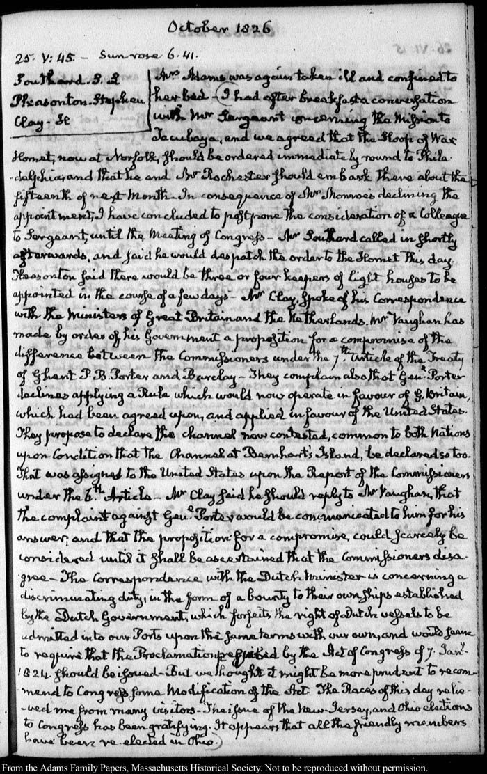 View full, authoritative transcriptions with page images of the diaries at John Quincy Adams Digital Diary part of the Primary Source Cooperative at the MHS.