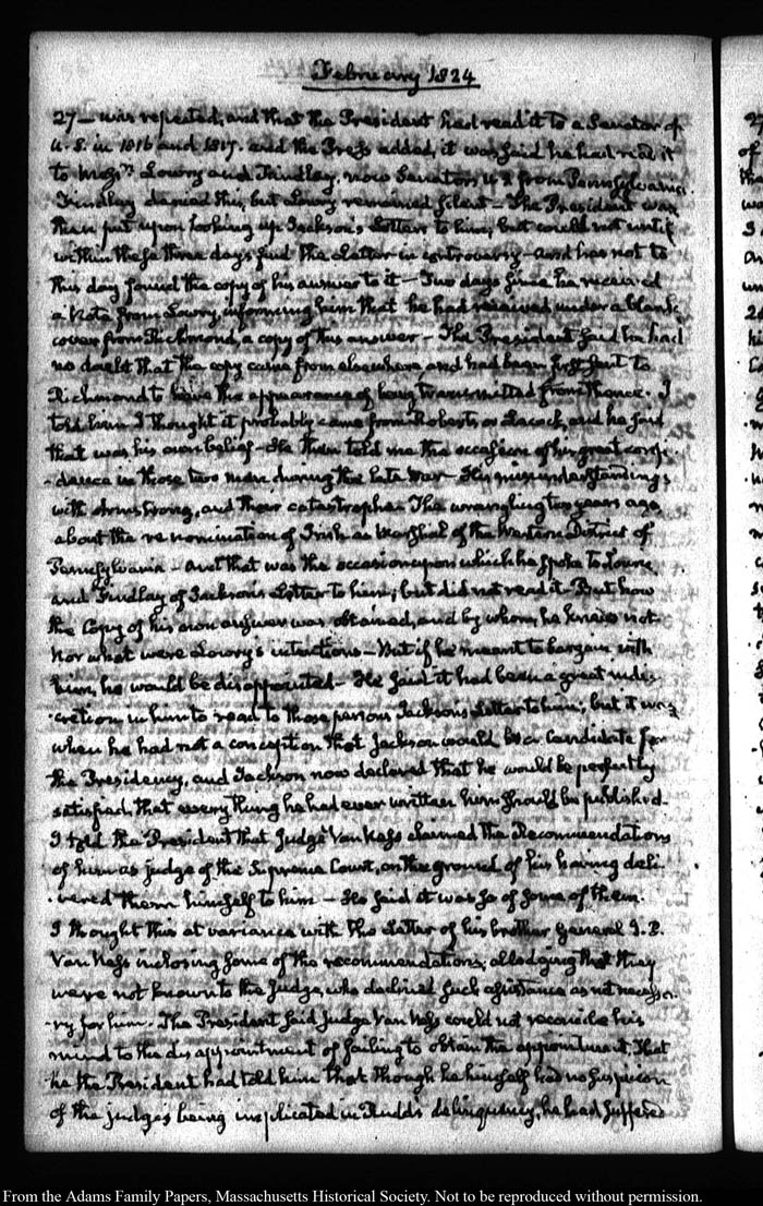 View full, authoritative transcriptions with page images of the diaries at John Quincy Adams Digital Diary part of the Primary Source Cooperative at the MHS.