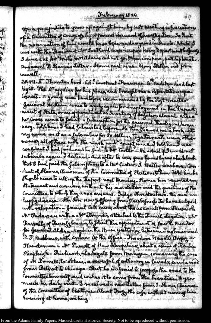 View full, authoritative transcriptions with page images of the diaries at John Quincy Adams Digital Diary part of the Primary Source Cooperative at the MHS.