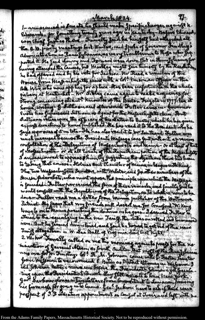 View full, authoritative transcriptions with page images of the diaries at John Quincy Adams Digital Diary part of the Primary Source Cooperative at the MHS.