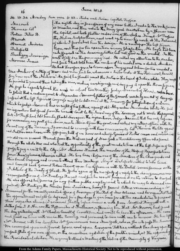 View full, authoritative transcriptions with page images of the diaries at John Quincy Adams Digital Diary part of the Primary Source Cooperative at the MHS.