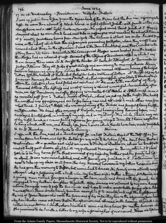 View full, authoritative transcriptions with page images of the diaries at John Quincy Adams Digital Diary part of the Primary Source Cooperative at the MHS.