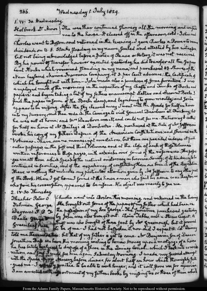 View full, authoritative transcriptions with page images of the diaries at John Quincy Adams Digital Diary part of the Primary Source Cooperative at the MHS.