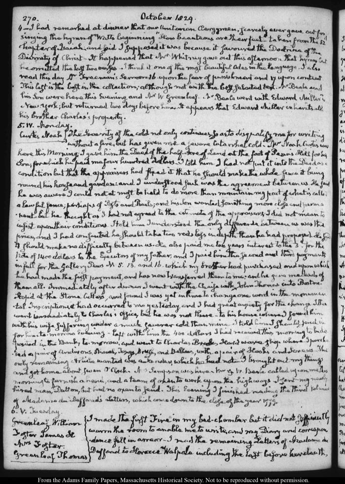 View full, authoritative transcriptions with page images of the diaries at John Quincy Adams Digital Diary part of the Primary Source Cooperative at the MHS.