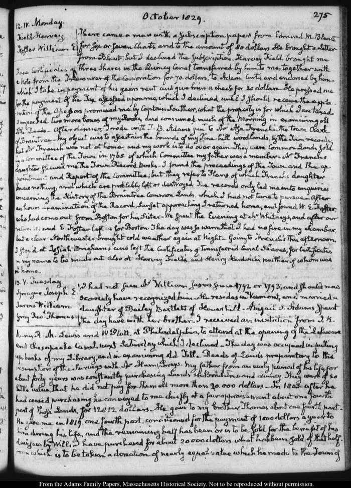 View full, authoritative transcriptions with page images of the diaries at John Quincy Adams Digital Diary part of the Primary Source Cooperative at the MHS.