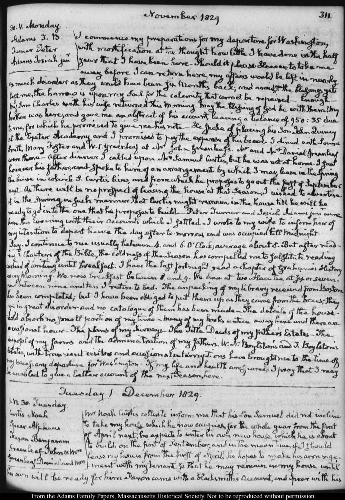 View full, authoritative transcriptions with page images of the diaries at John Quincy Adams Digital Diary part of the Primary Source Cooperative at the MHS.