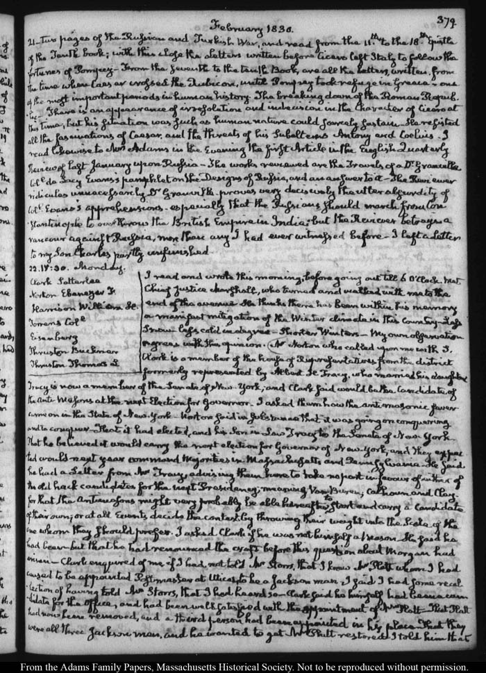 View full, authoritative transcriptions with page images of the diaries at John Quincy Adams Digital Diary part of the Primary Source Cooperative at the MHS.