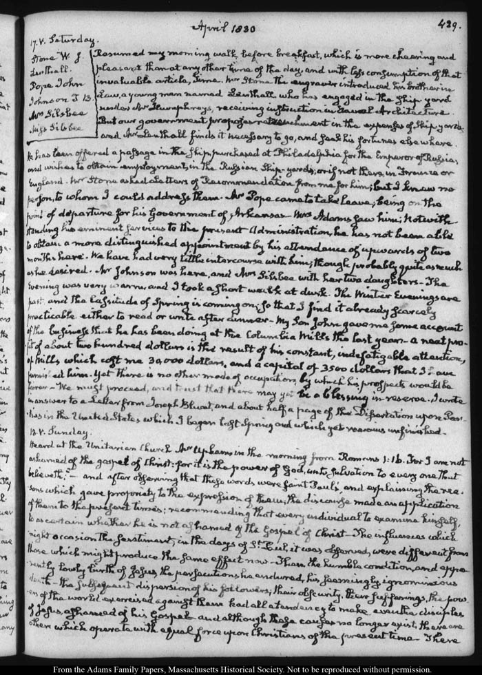 View full, authoritative transcriptions with page images of the diaries at John Quincy Adams Digital Diary part of the Primary Source Cooperative at the MHS.