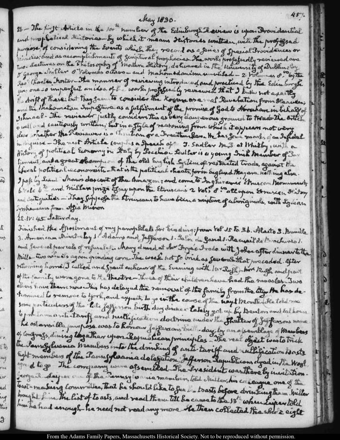 View full, authoritative transcriptions with page images of the diaries at John Quincy Adams Digital Diary part of the Primary Source Cooperative at the MHS.