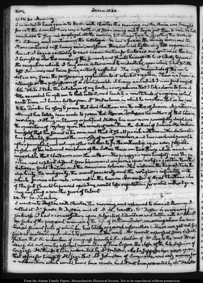 View full, authoritative transcriptions with page images of the diaries at John Quincy Adams Digital Diary part of the Primary Source Cooperative at the MHS.