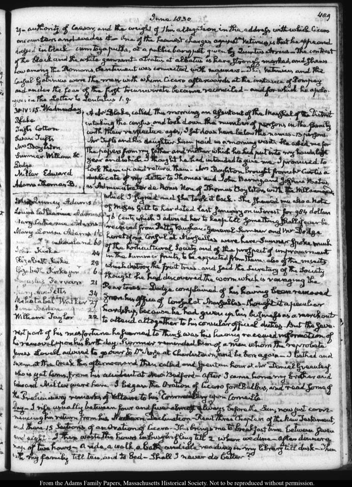 View full, authoritative transcriptions with page images of the diaries at John Quincy Adams Digital Diary part of the Primary Source Cooperative at the MHS.