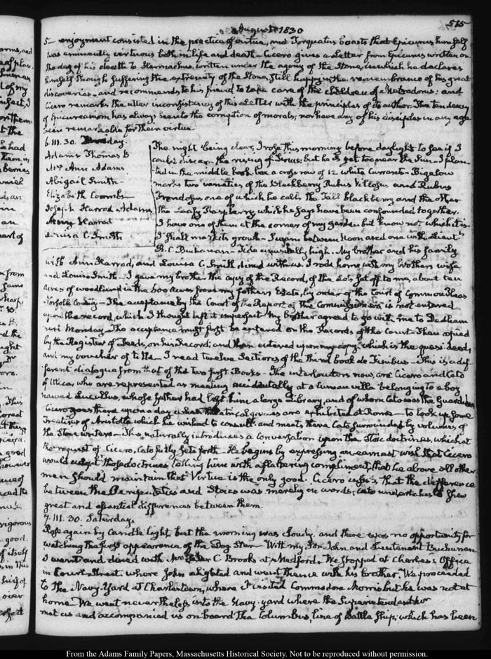 View full, authoritative transcriptions with page images of the diaries at John Quincy Adams Digital Diary part of the Primary Source Cooperative at the MHS.