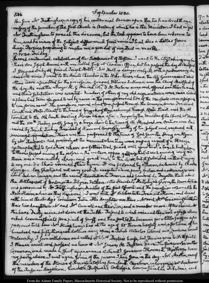 View full, authoritative transcriptions with page images of the diaries at John Quincy Adams Digital Diary part of the Primary Source Cooperative at the MHS.