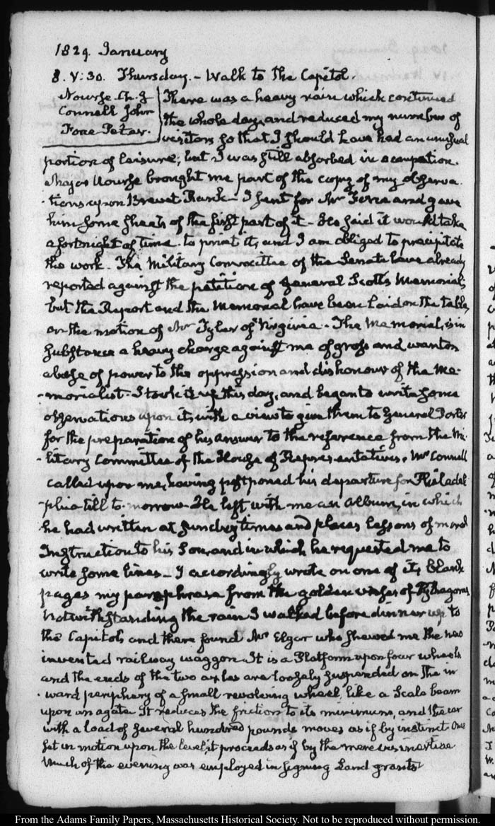 View full, authoritative transcriptions with page images of the diaries at John Quincy Adams Digital Diary part of the Primary Source Cooperative at the MHS.