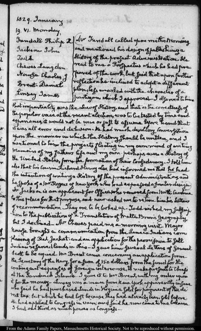View full, authoritative transcriptions with page images of the diaries at John Quincy Adams Digital Diary part of the Primary Source Cooperative at the MHS.