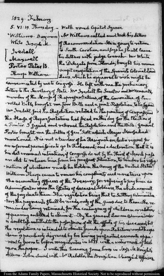 View full, authoritative transcriptions with page images of the diaries at John Quincy Adams Digital Diary part of the Primary Source Cooperative at the MHS.