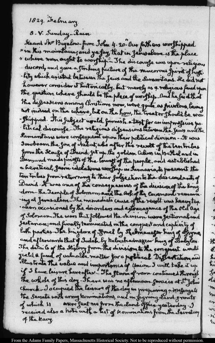 View full, authoritative transcriptions with page images of the diaries at John Quincy Adams Digital Diary part of the Primary Source Cooperative at the MHS.