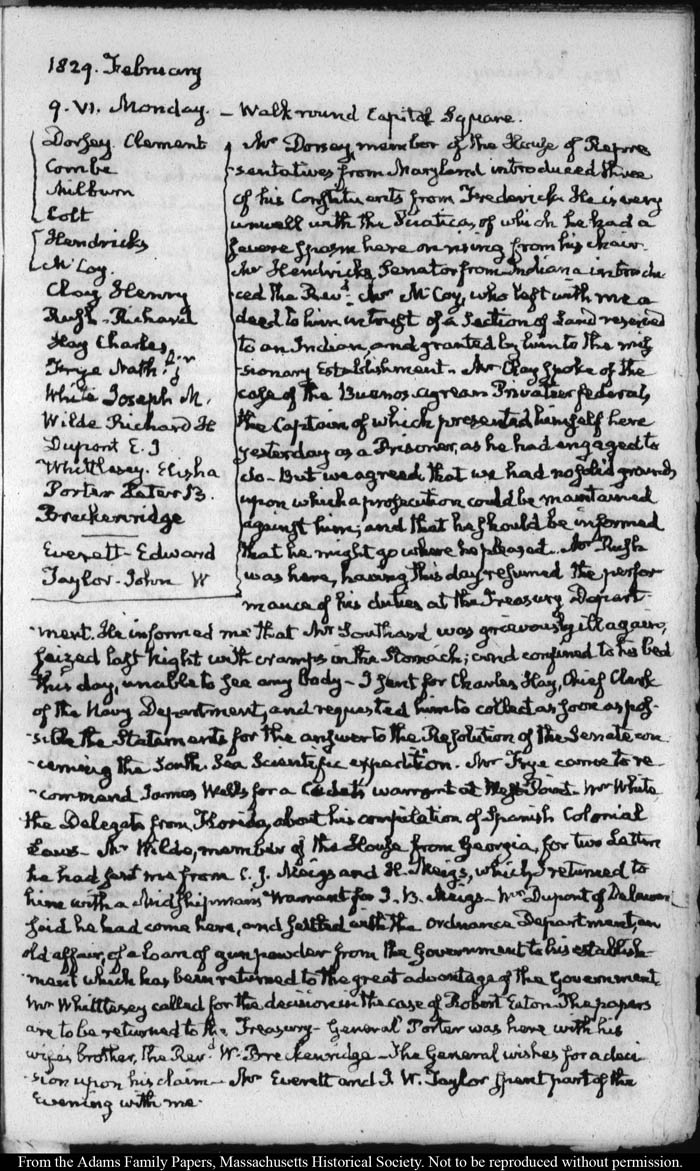 View full, authoritative transcriptions with page images of the diaries at John Quincy Adams Digital Diary part of the Primary Source Cooperative at the MHS.