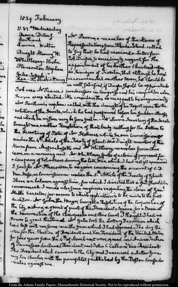 View full, authoritative transcriptions with page images of the diaries at John Quincy Adams Digital Diary part of the Primary Source Cooperative at the MHS.