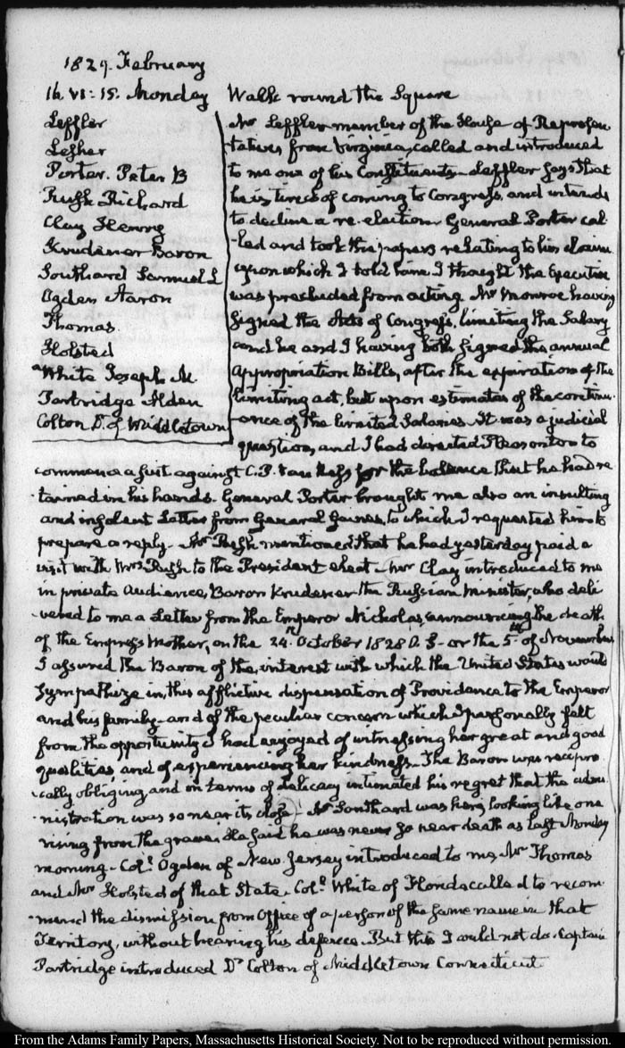 View full, authoritative transcriptions with page images of the diaries at John Quincy Adams Digital Diary part of the Primary Source Cooperative at the MHS.