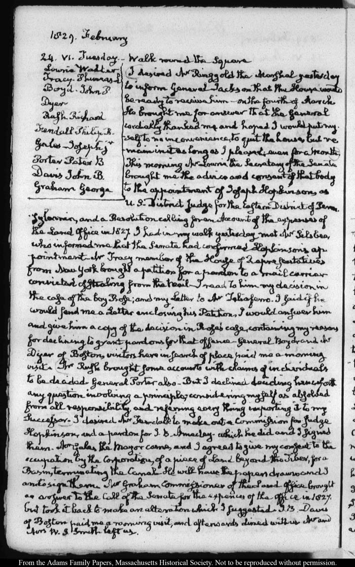View full, authoritative transcriptions with page images of the diaries at John Quincy Adams Digital Diary part of the Primary Source Cooperative at the MHS.