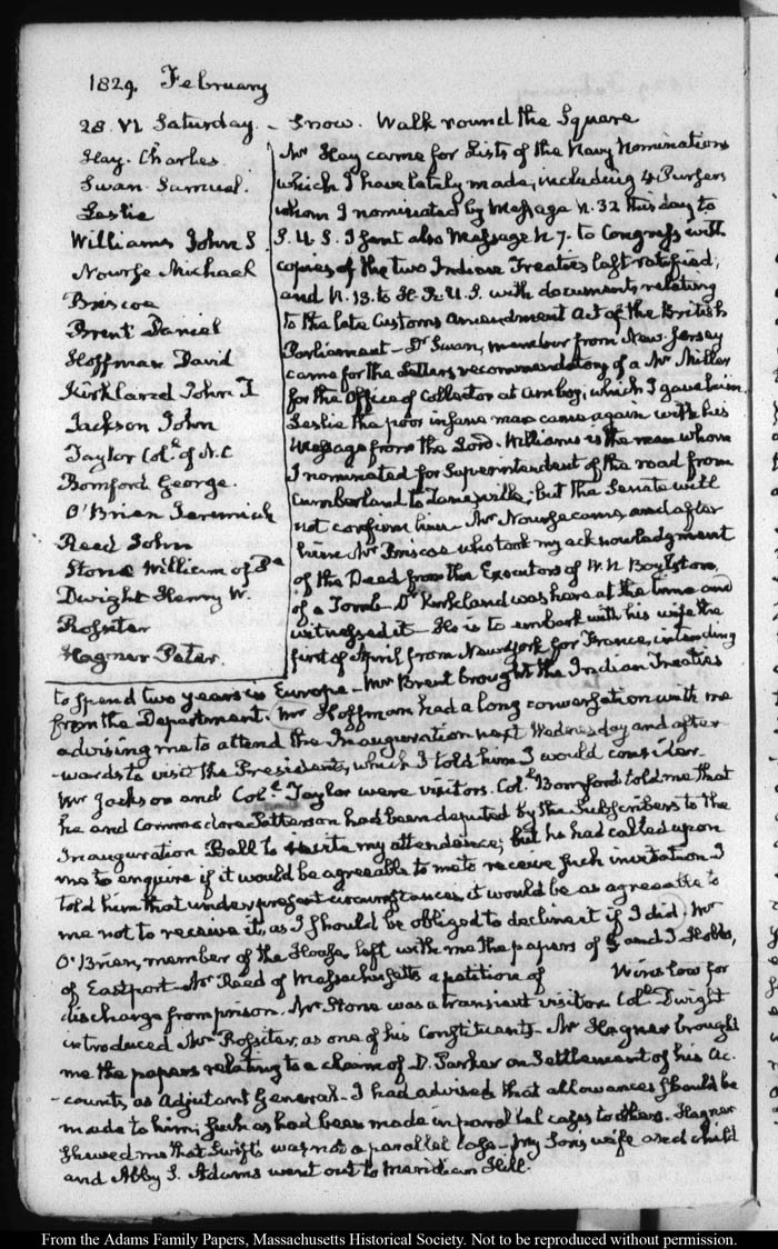 View full, authoritative transcriptions with page images of the diaries at John Quincy Adams Digital Diary part of the Primary Source Cooperative at the MHS.