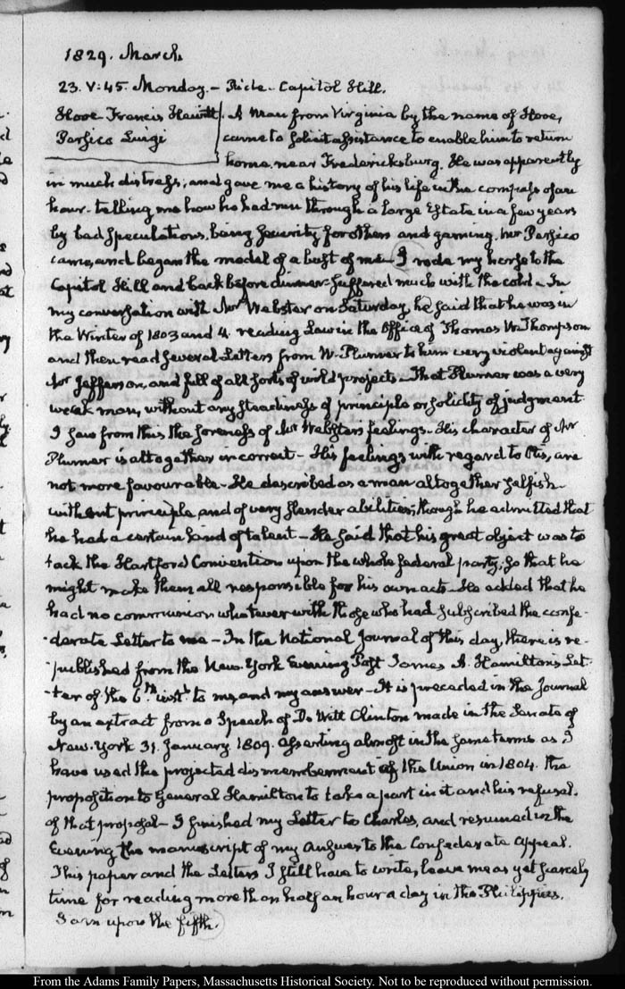 View full, authoritative transcriptions with page images of the diaries at John Quincy Adams Digital Diary part of the Primary Source Cooperative at the MHS.
