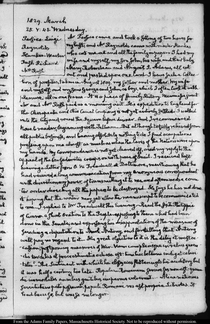 View full, authoritative transcriptions with page images of the diaries at John Quincy Adams Digital Diary part of the Primary Source Cooperative at the MHS.