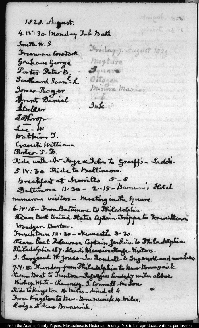 View full, authoritative transcriptions with page images of the diaries at John Quincy Adams Digital Diary part of the Primary Source Cooperative at the MHS.