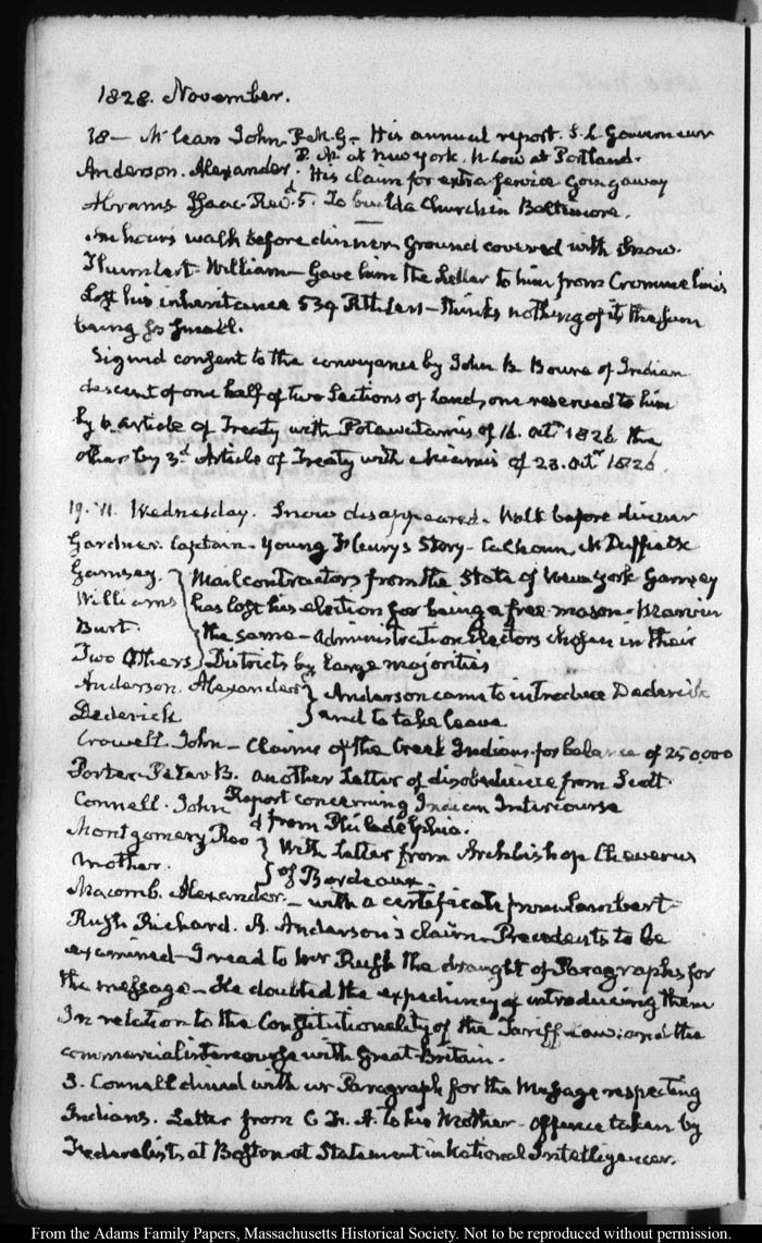 View full, authoritative transcriptions with page images of the diaries at John Quincy Adams Digital Diary part of the Primary Source Cooperative at the MHS.