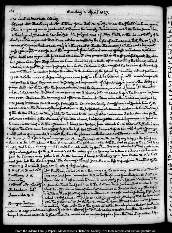 View full, authoritative transcriptions with page images of the diaries at John Quincy Adams Digital Diary part of the Primary Source Cooperative at the MHS.