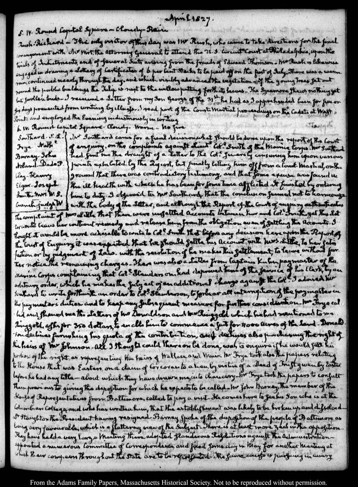 View full, authoritative transcriptions with page images of the diaries at John Quincy Adams Digital Diary part of the Primary Source Cooperative at the MHS.
