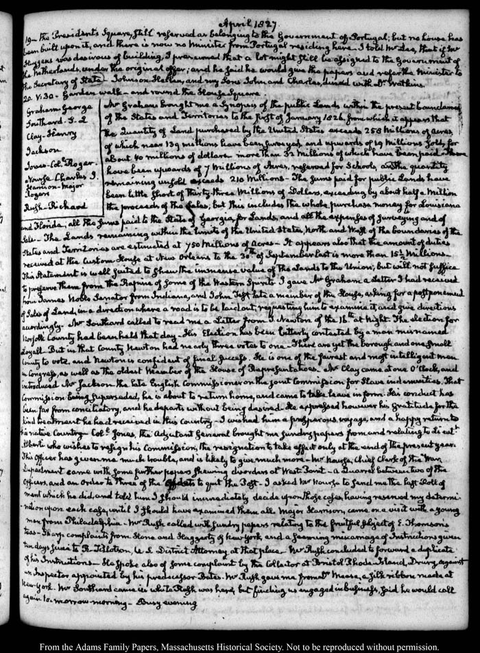 View full, authoritative transcriptions with page images of the diaries at John Quincy Adams Digital Diary part of the Primary Source Cooperative at the MHS.