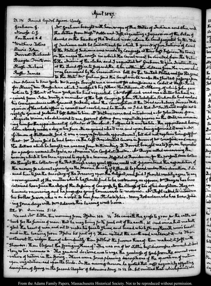 View full, authoritative transcriptions with page images of the diaries at John Quincy Adams Digital Diary part of the Primary Source Cooperative at the MHS.