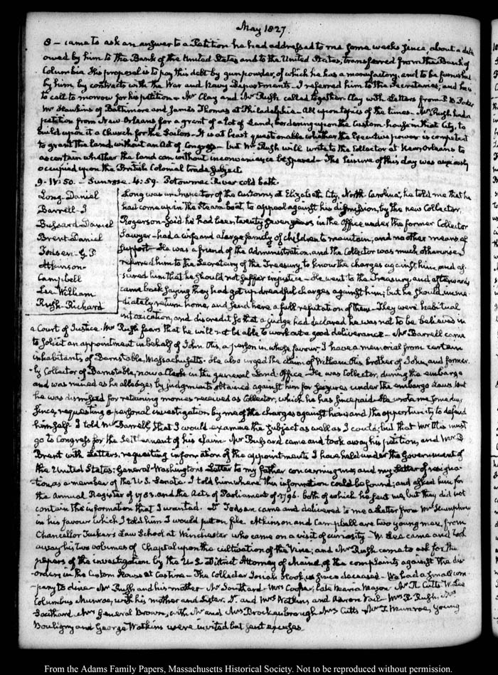 View full, authoritative transcriptions with page images of the diaries at John Quincy Adams Digital Diary part of the Primary Source Cooperative at the MHS.
