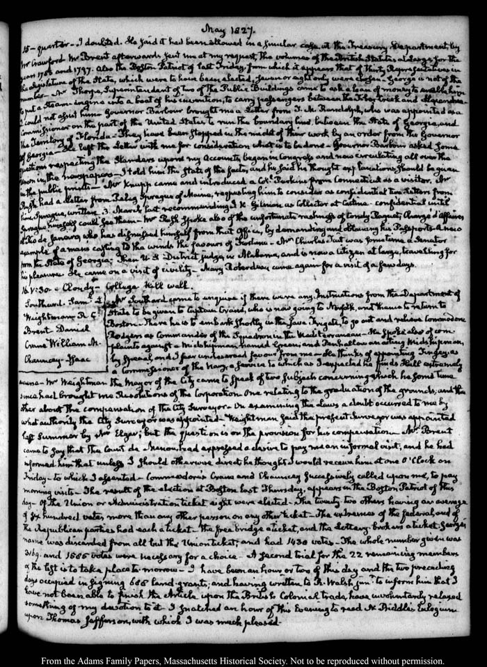 View full, authoritative transcriptions with page images of the diaries at John Quincy Adams Digital Diary part of the Primary Source Cooperative at the MHS.