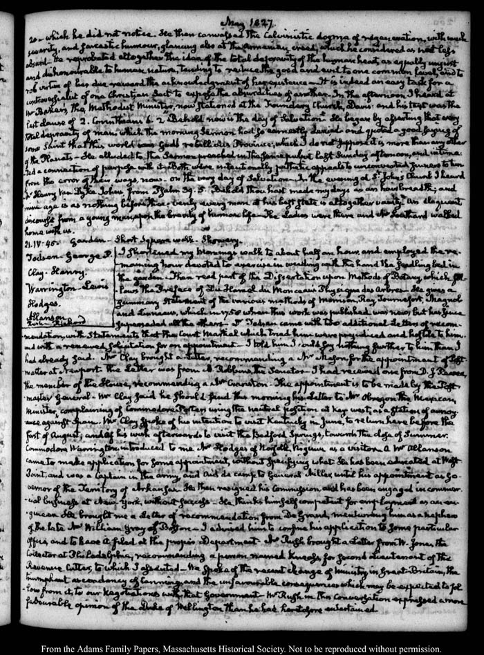 View full, authoritative transcriptions with page images of the diaries at John Quincy Adams Digital Diary part of the Primary Source Cooperative at the MHS.