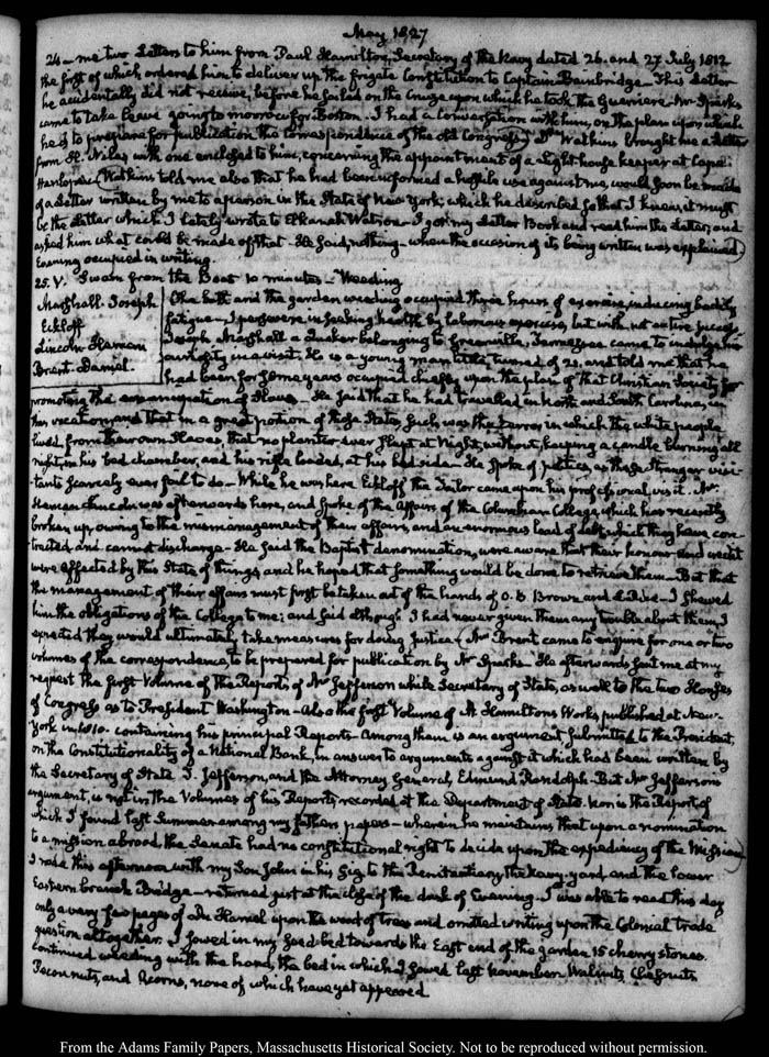 View full, authoritative transcriptions with page images of the diaries at John Quincy Adams Digital Diary part of the Primary Source Cooperative at the MHS.