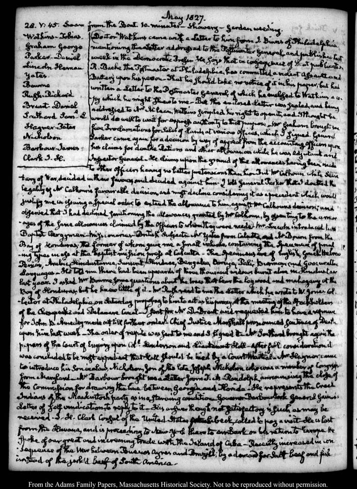 View full, authoritative transcriptions with page images of the diaries at John Quincy Adams Digital Diary part of the Primary Source Cooperative at the MHS.