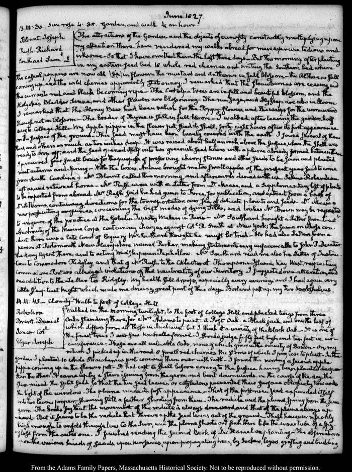 View full, authoritative transcriptions with page images of the diaries at John Quincy Adams Digital Diary part of the Primary Source Cooperative at the MHS.