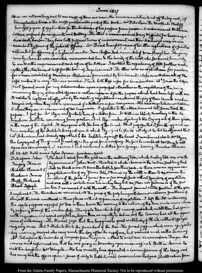 View full, authoritative transcriptions with page images of the diaries at John Quincy Adams Digital Diary part of the Primary Source Cooperative at the MHS.