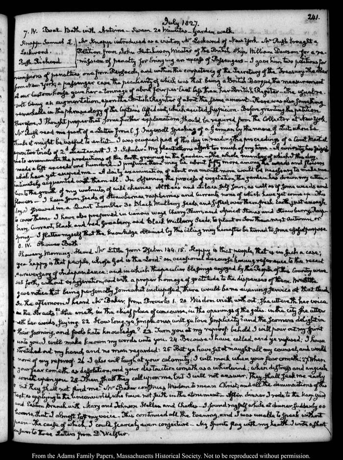 View full, authoritative transcriptions with page images of the diaries at John Quincy Adams Digital Diary part of the Primary Source Cooperative at the MHS.