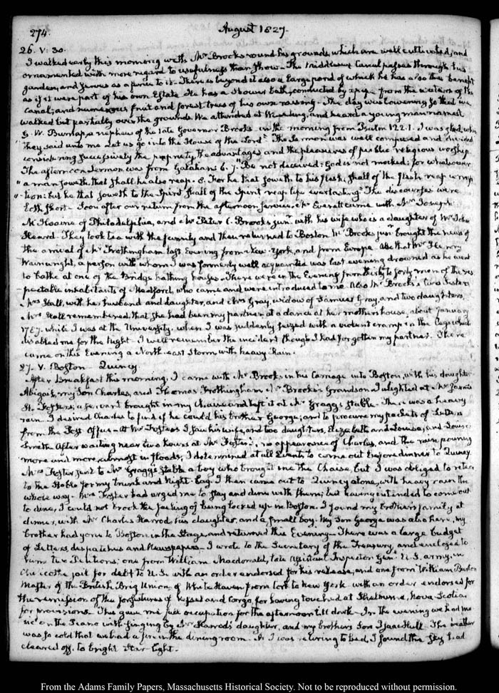 View full, authoritative transcriptions with page images of the diaries at John Quincy Adams Digital Diary part of the Primary Source Cooperative at the MHS.