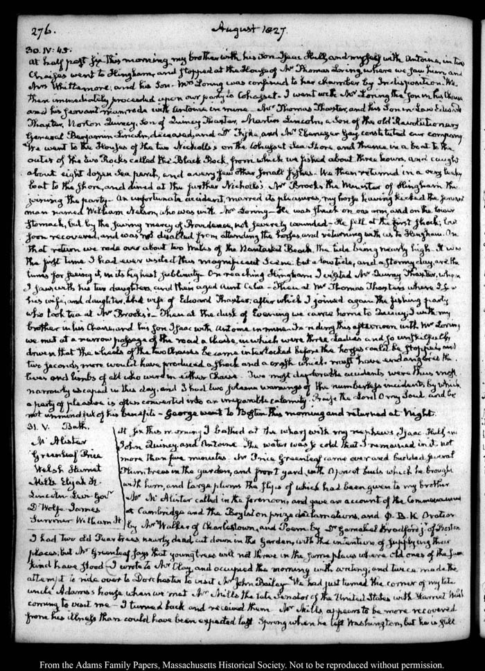 View full, authoritative transcriptions with page images of the diaries at John Quincy Adams Digital Diary part of the Primary Source Cooperative at the MHS.