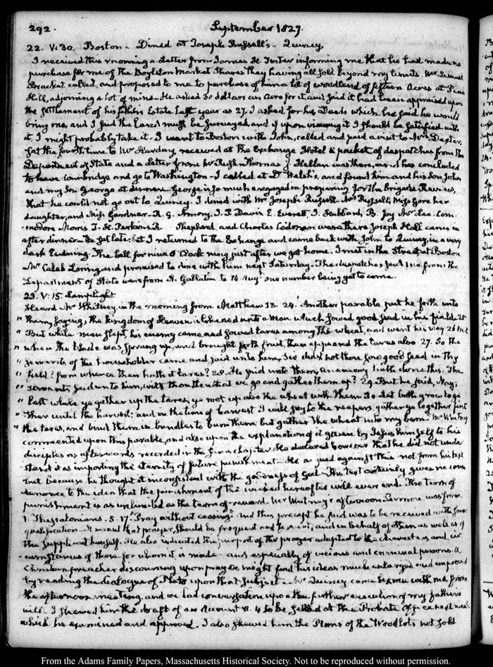 View full, authoritative transcriptions with page images of the diaries at John Quincy Adams Digital Diary part of the Primary Source Cooperative at the MHS.