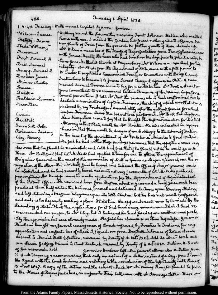 View full, authoritative transcriptions with page images of the diaries at John Quincy Adams Digital Diary part of the Primary Source Cooperative at the MHS.