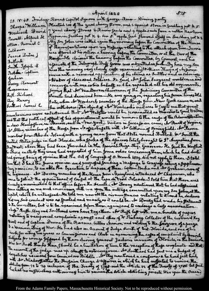 View full, authoritative transcriptions with page images of the diaries at John Quincy Adams Digital Diary part of the Primary Source Cooperative at the MHS.