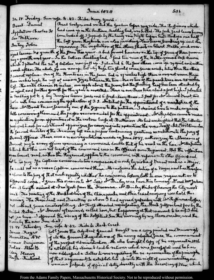 View full, authoritative transcriptions with page images of the diaries at John Quincy Adams Digital Diary part of the Primary Source Cooperative at the MHS.