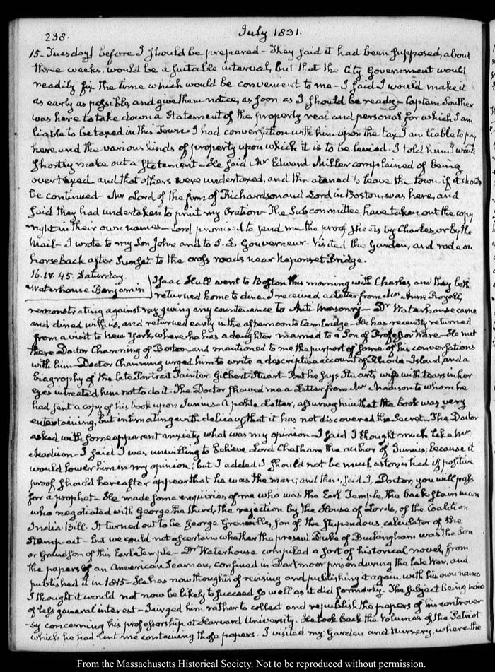View full, authoritative transcriptions with page images of the diaries at John Quincy Adams Digital Diary part of the Primary Source Cooperative at the MHS.